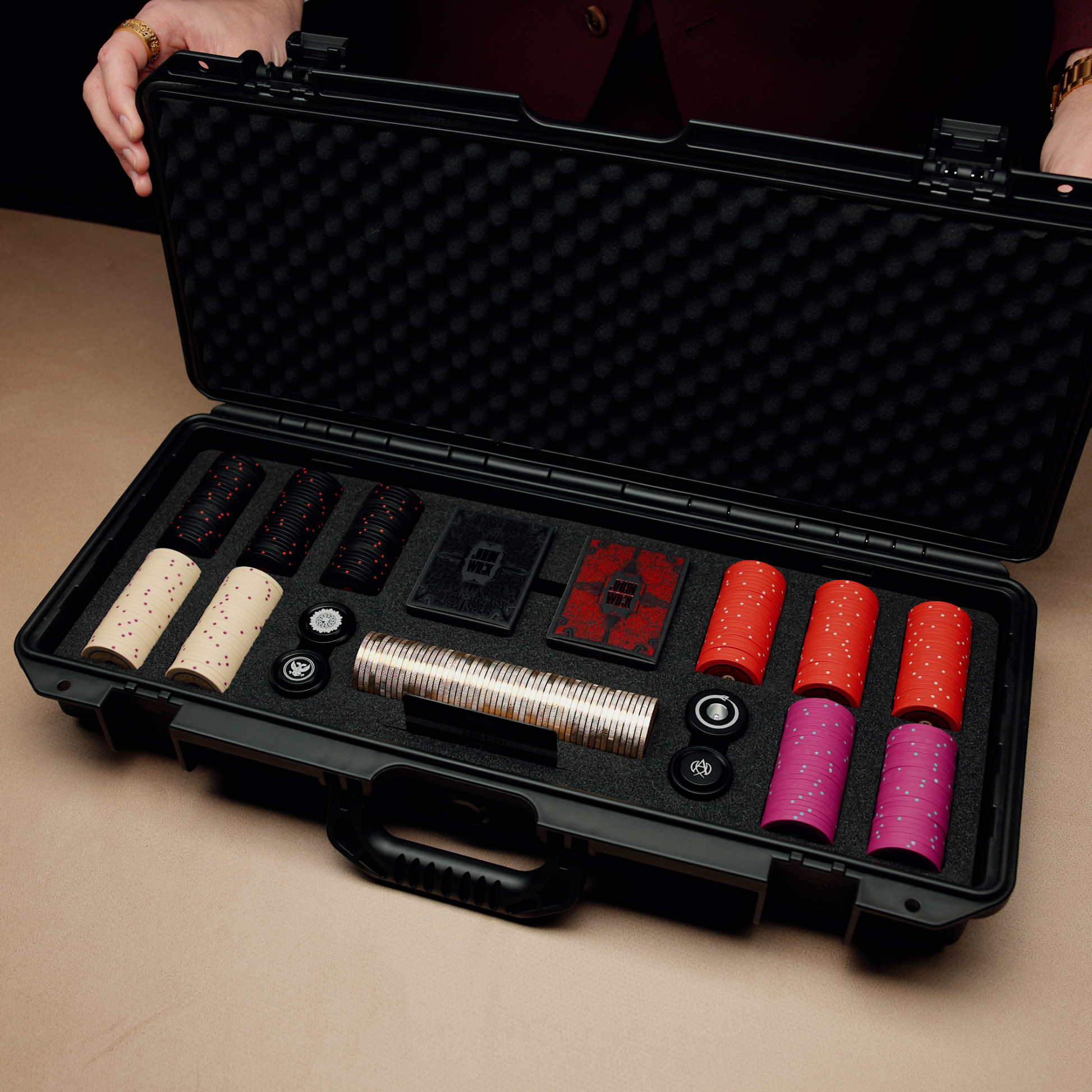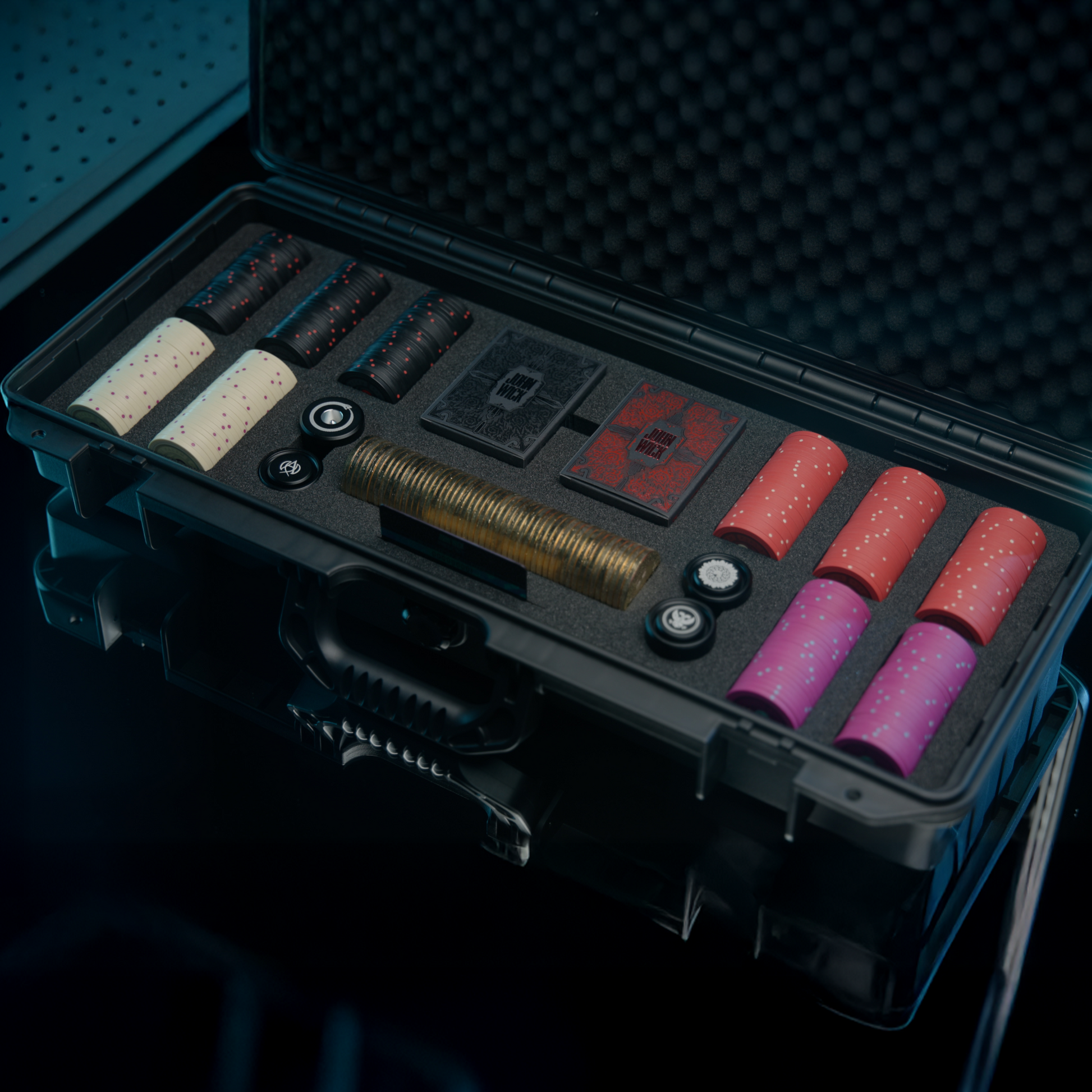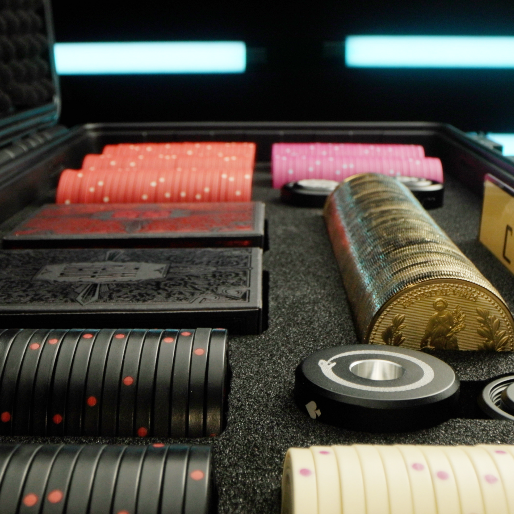 - Signature Dealer Stack – Four precision-machined aluminum pieces: Small Blind, Big Blind, and the 2-part Dealer Token. Assembles into a unified totem when the stakes demand it.